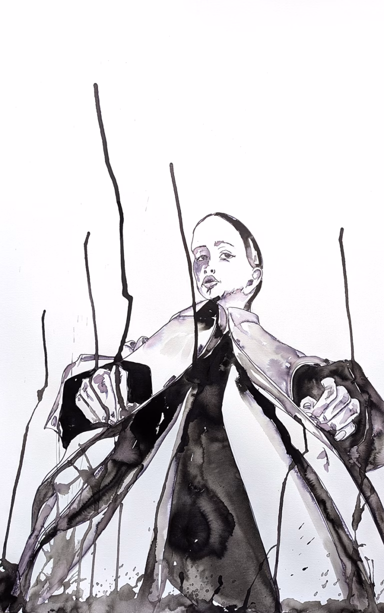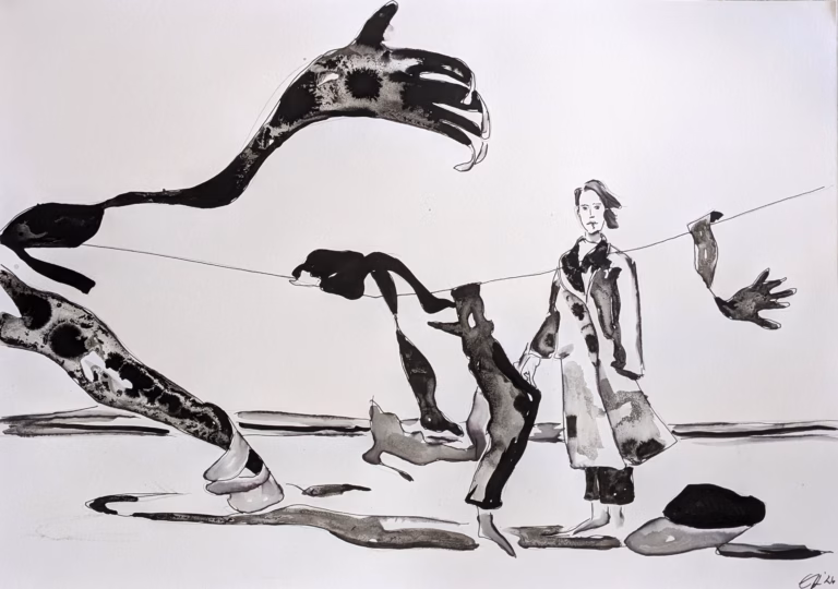 Meine Bilder entstehen oft in Tusche – schwarzweiß, reduziert, mit viel Raum für Zwischenräume. Die „Leerstellen“ sind für mich genauso wichtig wie die gemalten Flächen. Inspiration finde ich überall, oft in der stillen Schönheit des Alltäglichen. Immer wieder taucht das Wasser auf – als Element, als Spiegel, als Symbol. Warum? Vielleicht, weil es trägt und zugleich verbirgt.