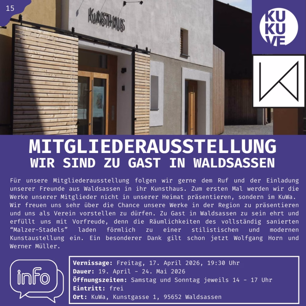 | Ausstellungen: | div. Gruppenausstellungen in Nürnberg und Regensburg seit 2023 vers. Mitgliederausstellungen bei KUKUVE Erbendorf Sammlung von Etwas, Einzelausstellung im Jungbrunnen Selb, 2024 Weite Räume, Kunstverein Hochfranken, 2024 Etwas Mehr, Einzelausstellung, MAKKultur, Marktredwitz, 2025 Zeichnung-Malerei-Skulptur, Ausstellung mit Heidi Götzfried, Kunsthaus Waldsassen, 2025 Heimat 3, Kunstverein Hochfranken/Selb, 2026 KunsTRäume 2026, Selb, Rosenthal Casino Gemeinschaftsausstellung KUKUVE, Kunsthaus Waldsassen, 2026 |